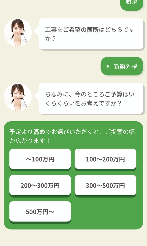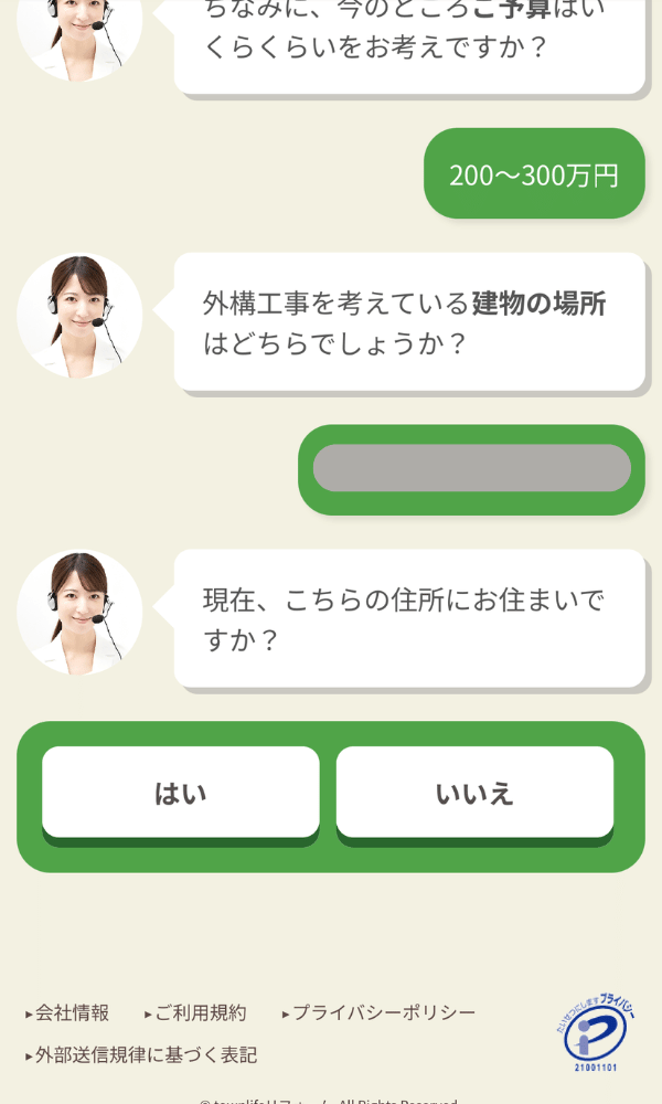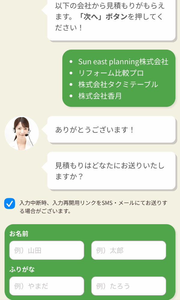 自動マッチングによる予期せぬ営業電話が多い他社サービスとは異なり、地域の業者リストから口コミを見て依頼先を自分で選べます。不要な営業電話や個人情報流出の心配がなく、約3分の簡単入力で無料見積もりやプラン作成が可能です。